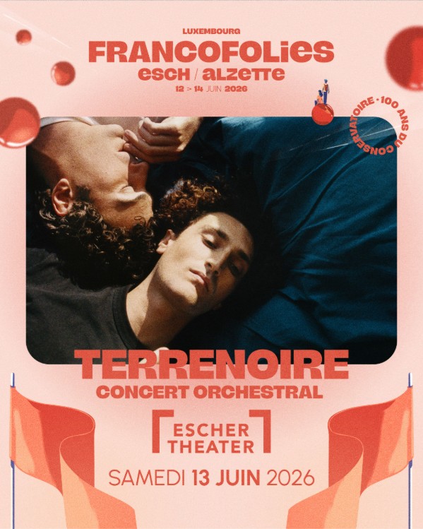 Le festival Les FrancofoliesEsch/Alzette est fier de dévoiler un volet exceptionnel de sa programmation. Le duo TERRENOIRE s’emparera de la scène de l’Escher Theater le samedi 13 juin pour une création unique en compagnie de l’orchestre d’Harmonie du Conservatoire d’Esch-sur-Alzette. Cette rencontre s’inscrit dans la célébration des cent ans du Conservatoire de la ville, unissant l’héritage musical local à la modernité du groupe.